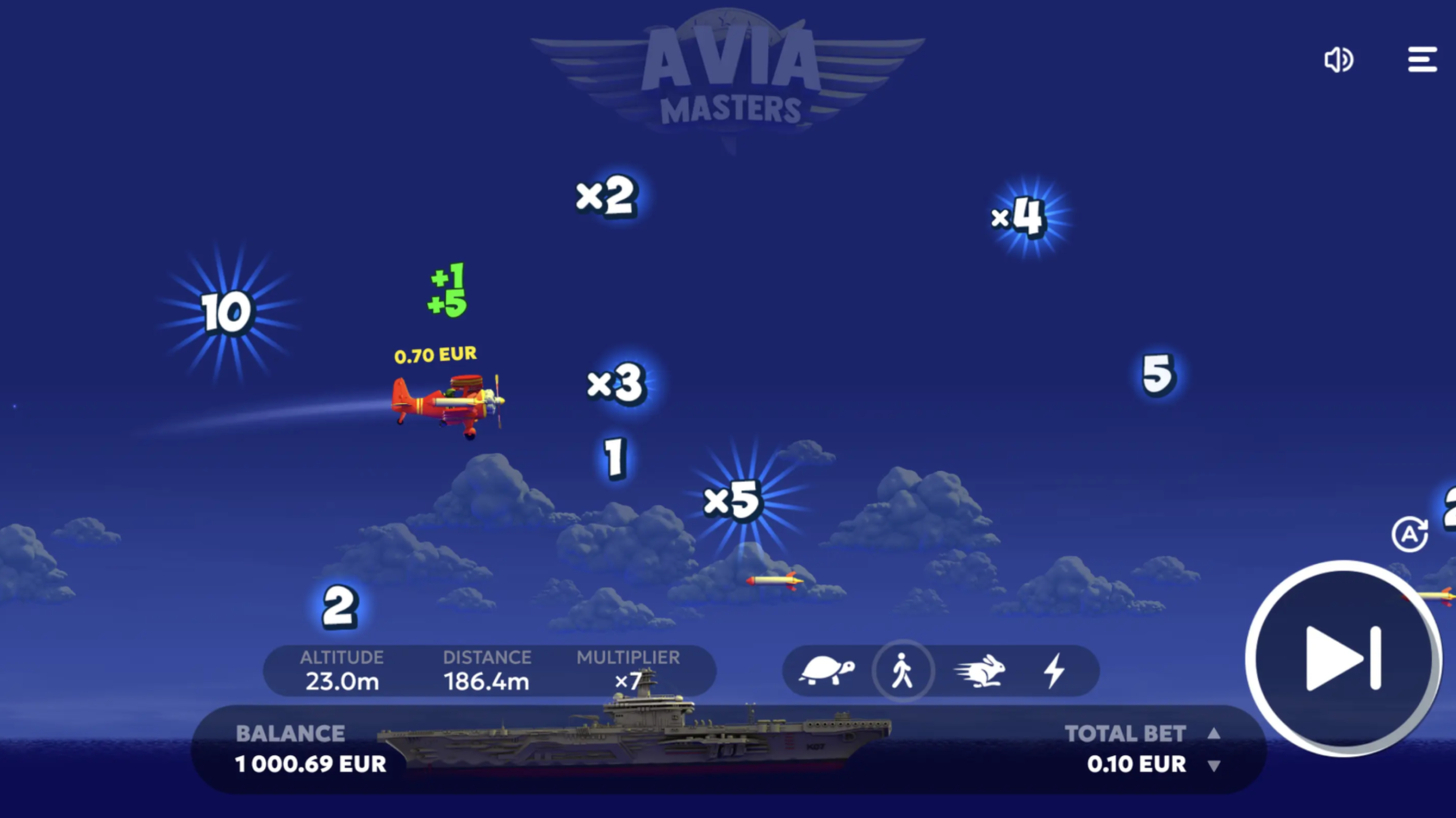 Start the Avia Masters casino game by choosing your game speed and selecting your bet. To launch your plane into its flight path, you just need to hit the play button, but this button is customisable, as you can adjust the opacity and size. As the plane flies, the Avia Masters game will present cash prizes and multipliers randomly.